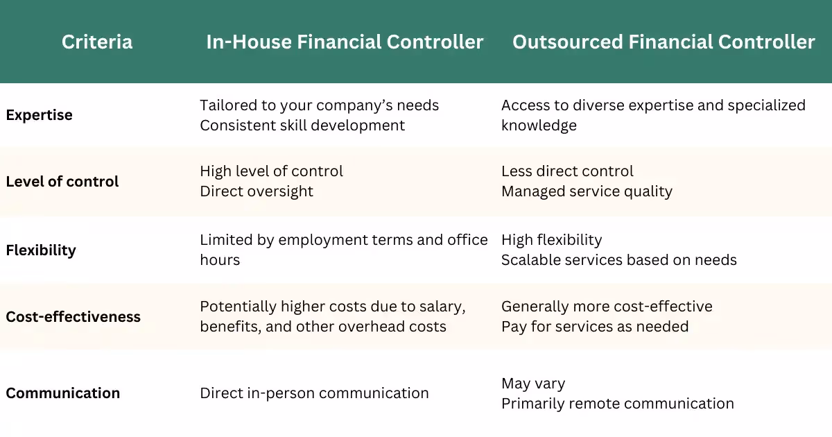 Before we get into all the details, if you want a quick run-down on the main differences between having an in-house financial controller or outsourcing this function, this table is for you: